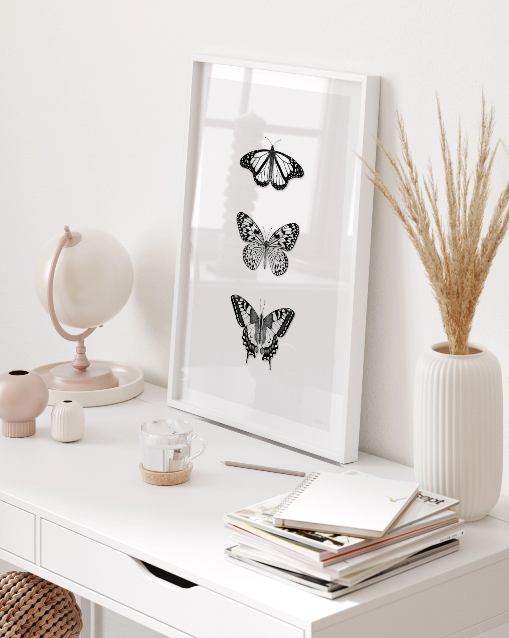 A delicate and refined composition, this graphite pencil drawing showcases three uniquely intricate butterflies, each with its own exquisite wing patterns. Set against a soft background colour, this artwork exudes elegance and tranquillity. Whether you’re styling a nursery, office, or living space, this piece blends seamlessly with neutral decor, adding a touch of organic beauty to your walls.